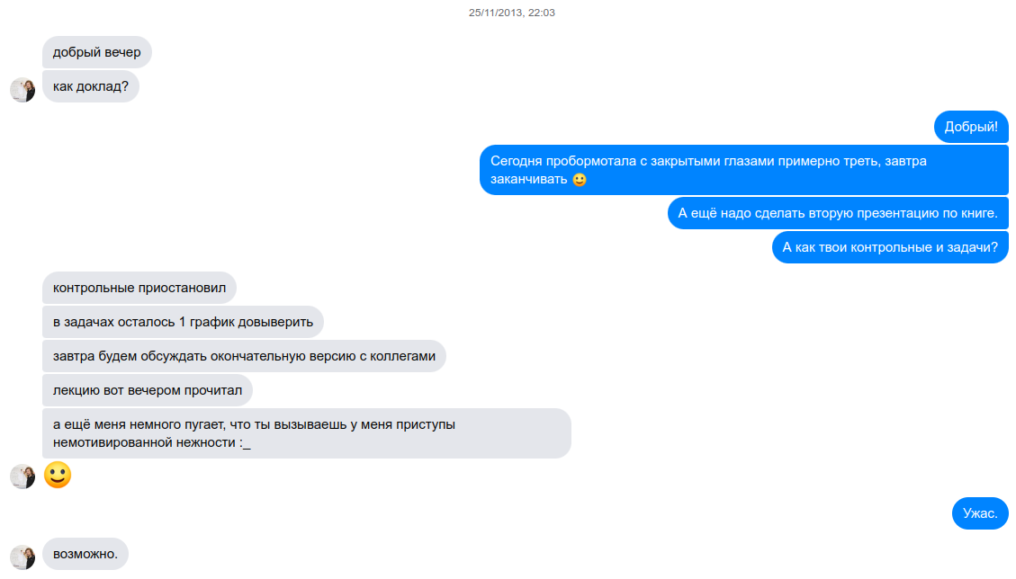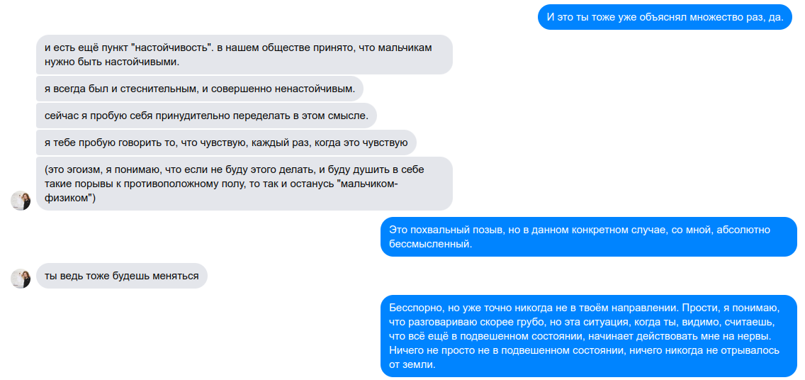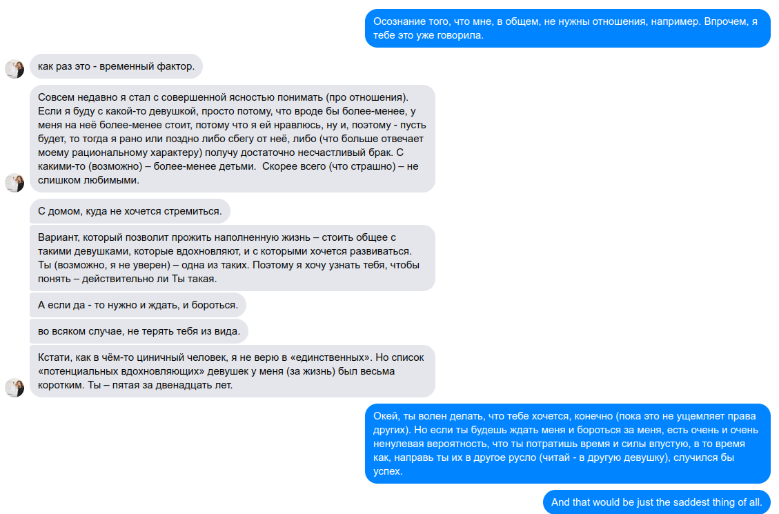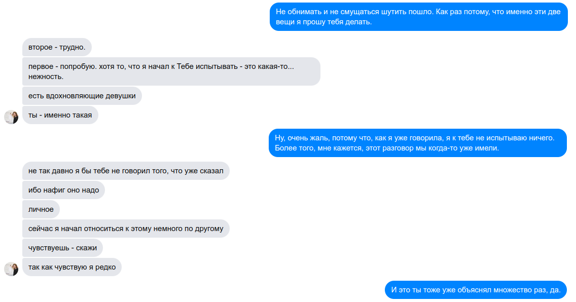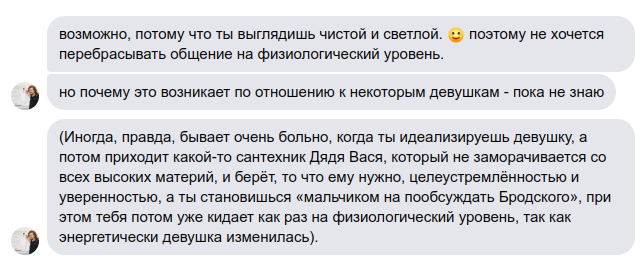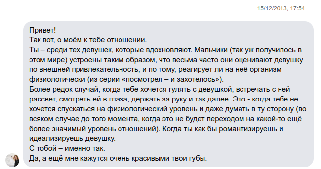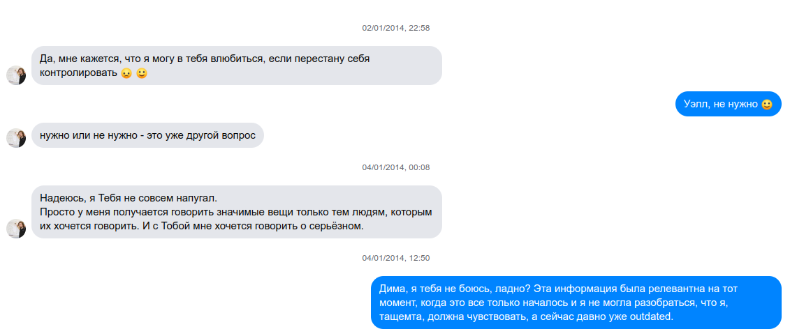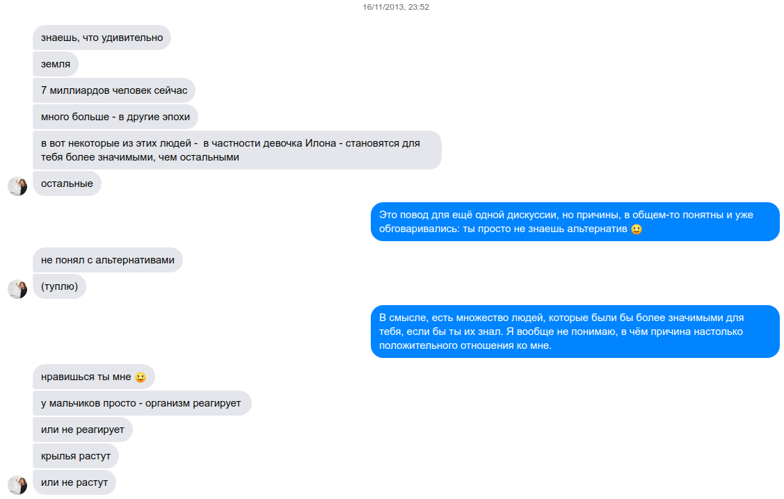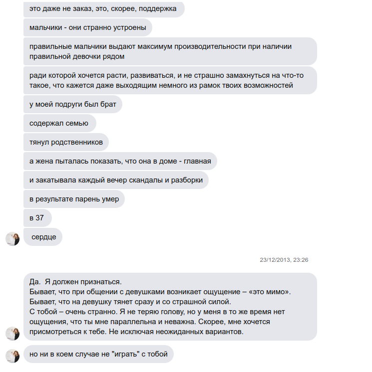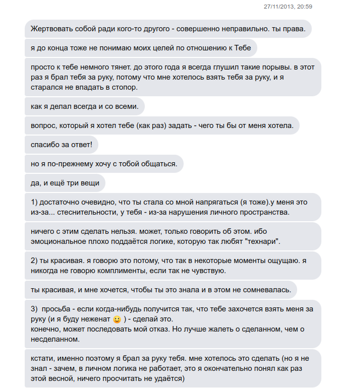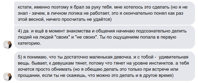 И таких сообщений десятки, сотни, они сыплются мне в личку каждый день, а я, конечно, отвечаю, не желая обидеть друга — тогда я действительно считала его близким другом. Комментировать каждое — излишне, пусть они поговорят сами за себя.