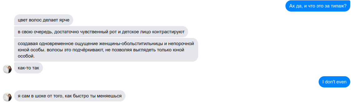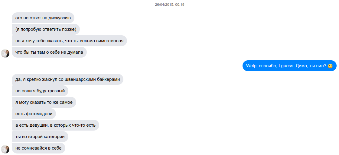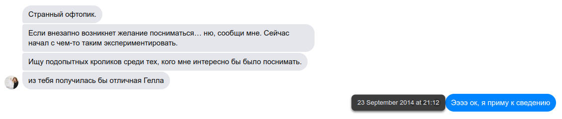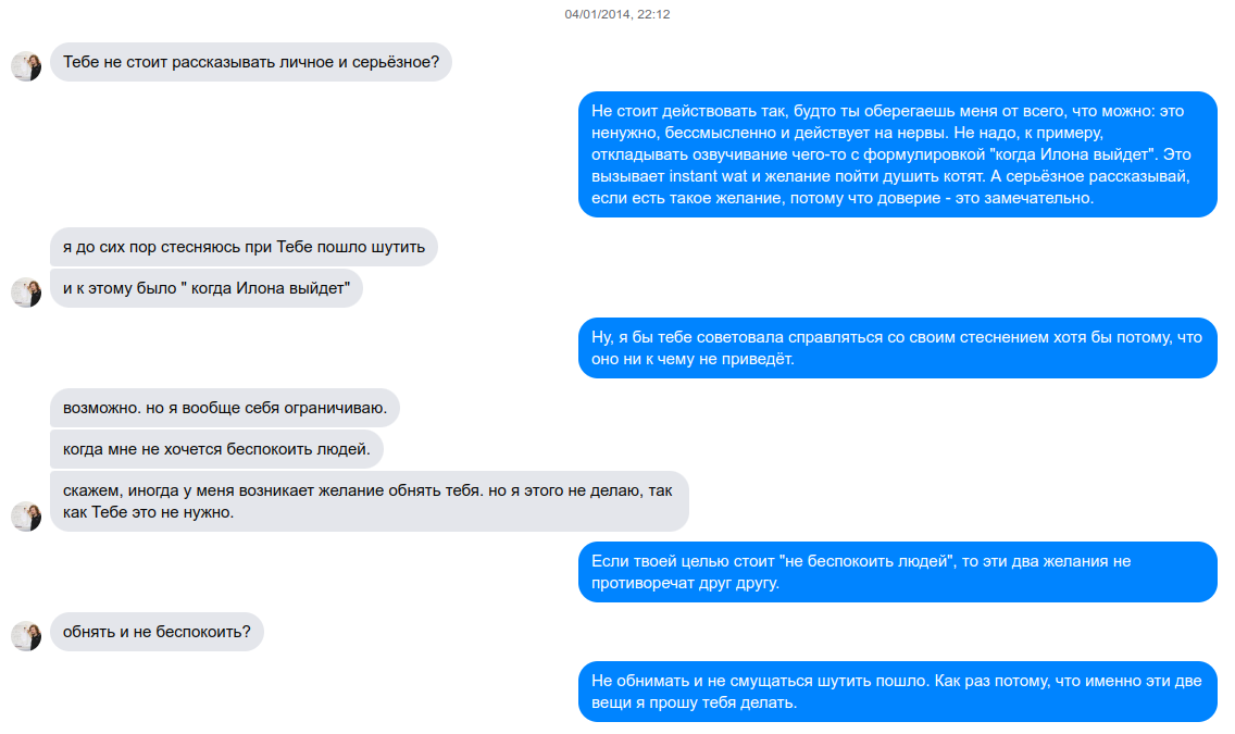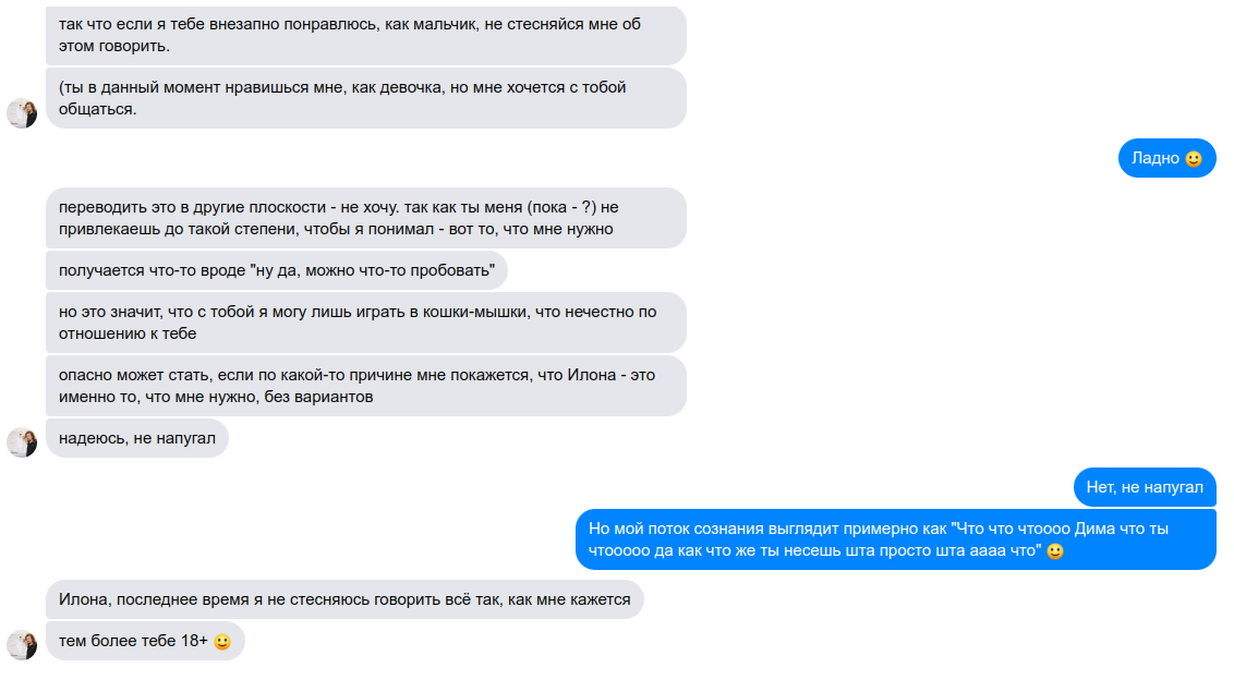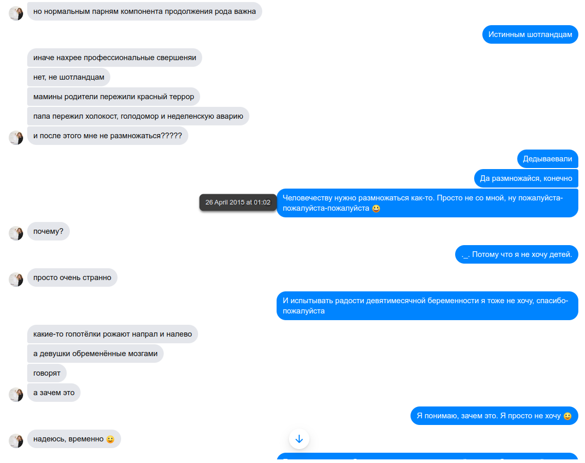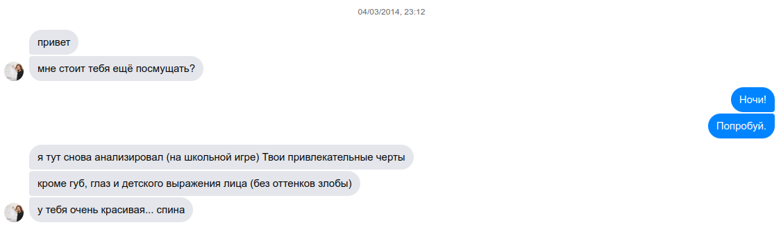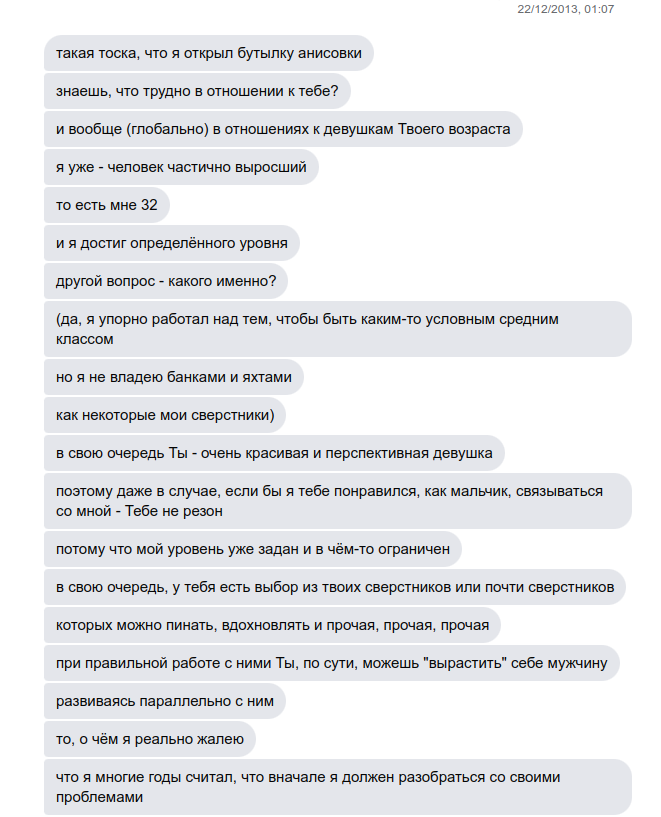 Сообщения эти пришли из ниоткуда, я их не хотела и не привечала, но всё ещё сохраняла надежду на корректное общение, и потому через два дня мы встретились на другом научно-популярном мероприятии от его друзей, куда он снова пригласил меня одну. К этому моменту он уже совершенно не скрывал своих намерений. Как вам, например, такие криповые намёки от человека почти вдвое старше?