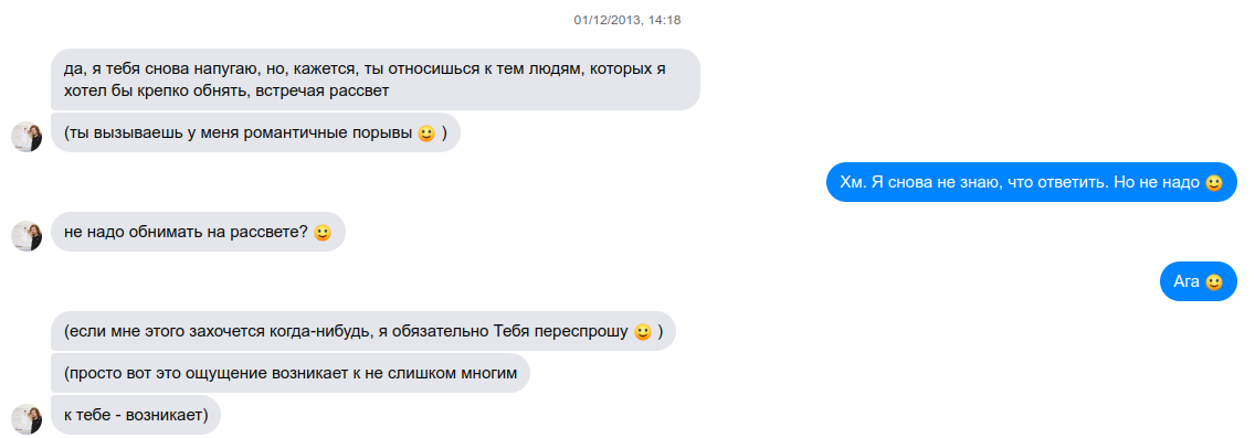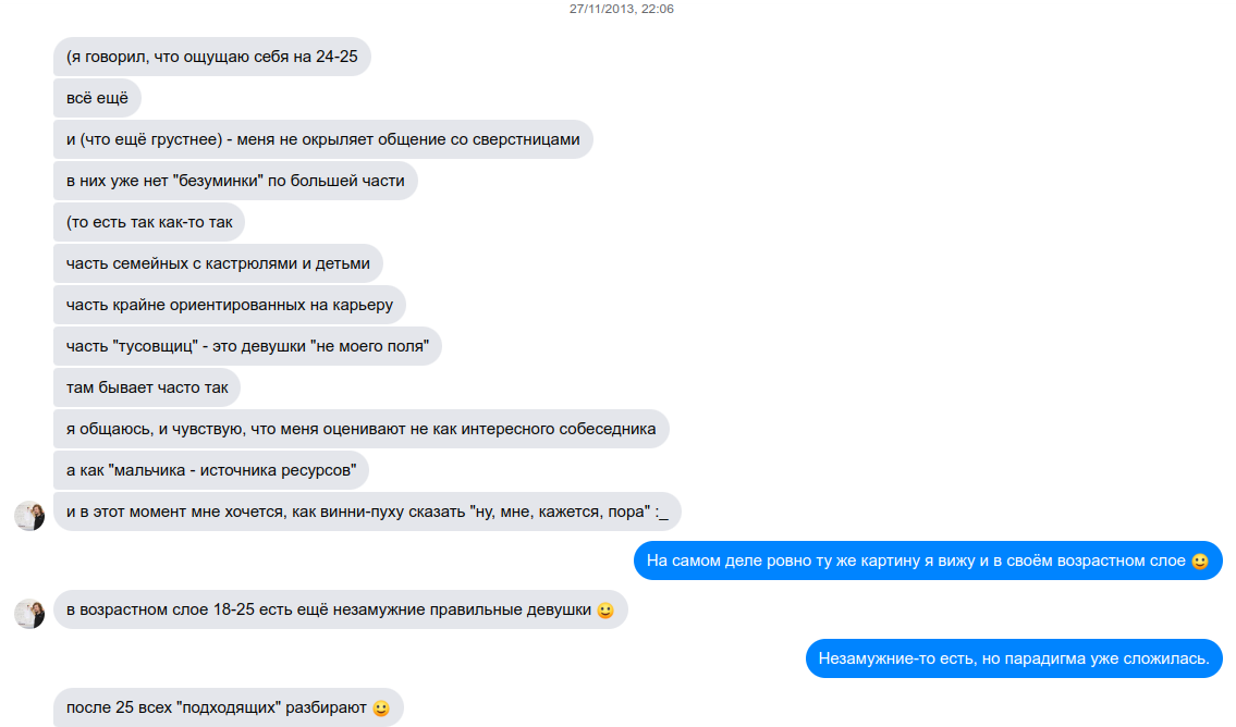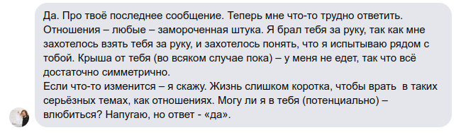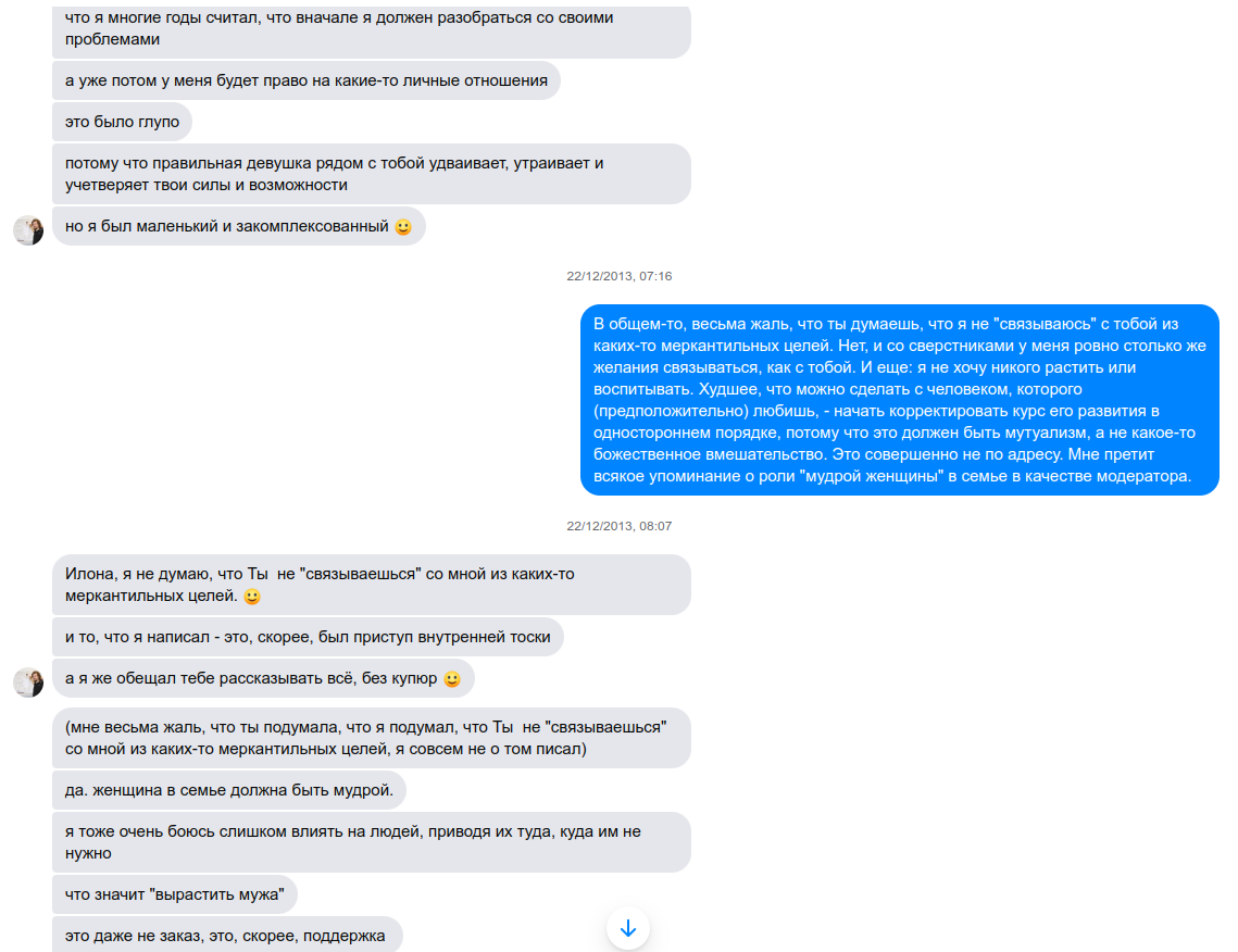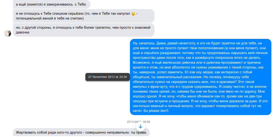 Нет. Я осознала свою неприязнь к этим подкатам в первые же дни и не стеснялась об этом сказать; 27 ноября, через всего 11 дней после раскрытия карт, состоялся уже, очевидно, не первый разговор об этом.