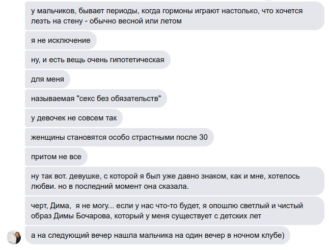 Я, к счастью, никак не пострадала физически. Но по уровню наивности я замечательно годилась на роль жертвы, и счастливый исход, я думаю, скорее случайность. В конце концов, мне известен случай, когда Бочаров в примерно тридцатипятилетнем возрасте был в «настоящих» отношениях с примерно двадцатилетней. И если у той девушки ситуация была хоть немного похожей, мне очень жаль.