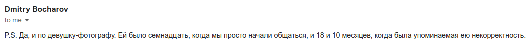 Я не очень хотела писать этот пост, и решила сделать это только после абсолютно ужасающих емэйлов и последовавших личных сообщений. На данный момент Дима клянётся, что такого больше не повторится, что всё осознал. Правда ли это? Надеюсь. Хотелось бы верить. Стоит ли создавать ему для такого условия, позволяя остаться на должностях, где он напрямую работает с детьми? Решать не мне. Я лишь считаю, что об этом должен знать каждый, кто принимает решение отдавать детей под его опеку.