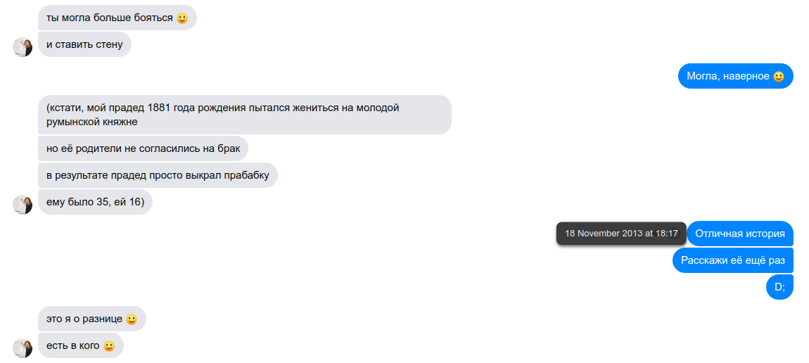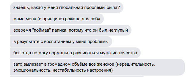 В какой-то момент он сказал: «Ты пошла в школу позже, чем я её закончил, такой вот забавный факт.» и взял меня за руку. Это было уже совсем за гранью омерзительного и неуместного, и я, кажется, нашла какой-то повод довольно быстро уйти. Откуда я знаю, что ушла быстро, если дело было аж 9 лет назад? Просто уже к полуночи того дня Дмитрий начал написывать мне в мессенджер. Эти сообщения после этого дня не прекращались почти два года.