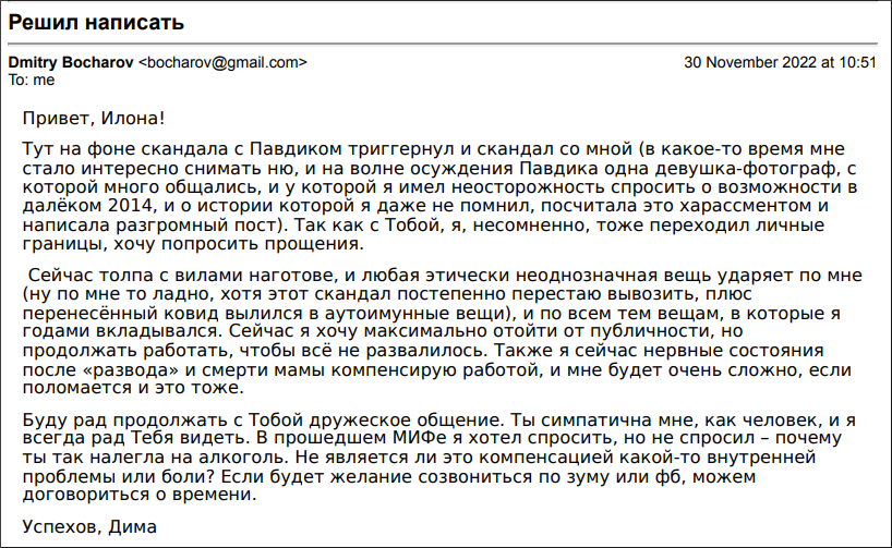 30 ноября 2022 года я вдруг получаю неожиданный (нет) емэйл от Димы. Я бы, если честно, хотела, чтобы там были слова повзрослевшего, осознавшего масштаб человека. Мне было бы достаточно человеческих извинений и взятия на себя ответственности. В конце концов, я не очень-то и пострадала, правда?